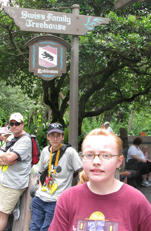 Upon entering from the central hub, the first major attraction encountered is the Swiss Family Treehouse on the left. Next, on the right, you will see