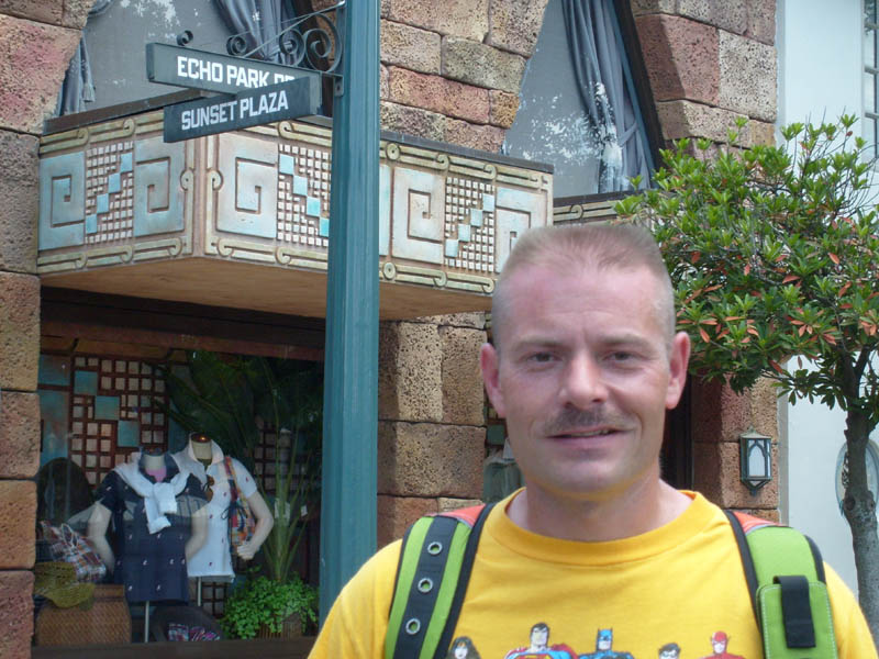 Execute an about-face. Walk back along Mickey Avenue, through Animation Courtyard, into the central hub, & move toward the park entrance. Turn left on Sunset Boulevard.