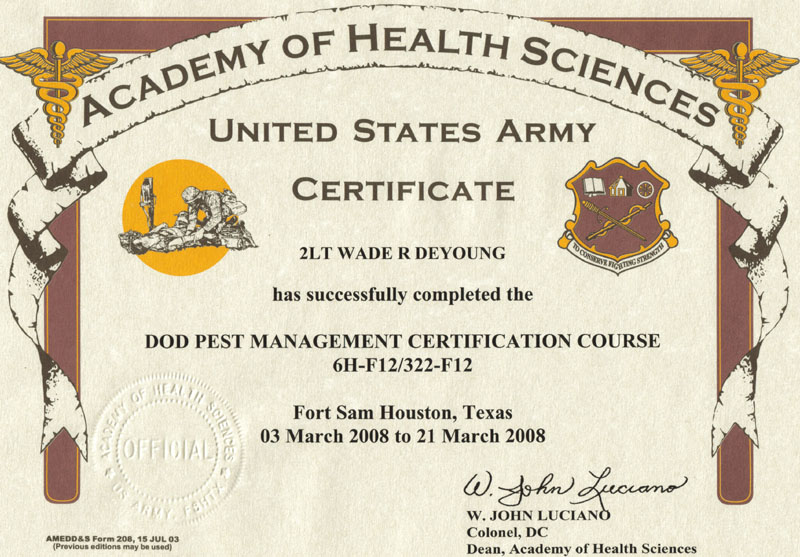 - Attended & graduated from DOD Pesticide Certification Course at Ft Sam Houston, San Antonio, TX