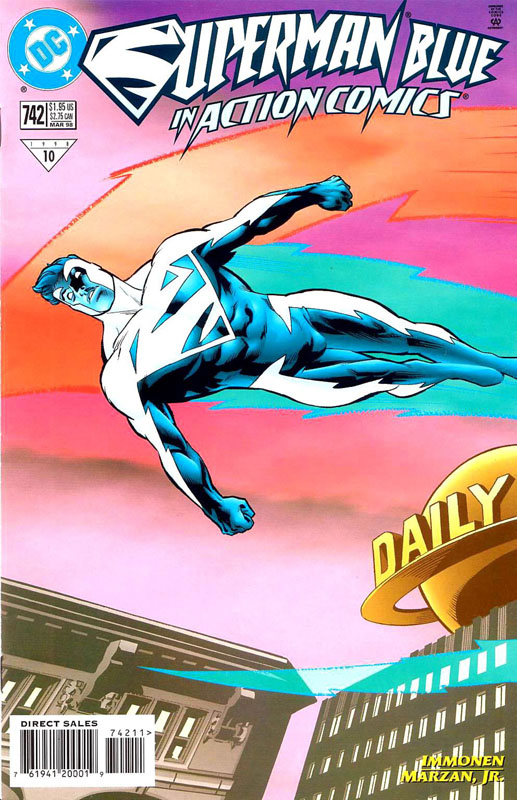 Supermen—blue and red.  In 1998, his two halves re-joined, and his traditional powers and costume returned.